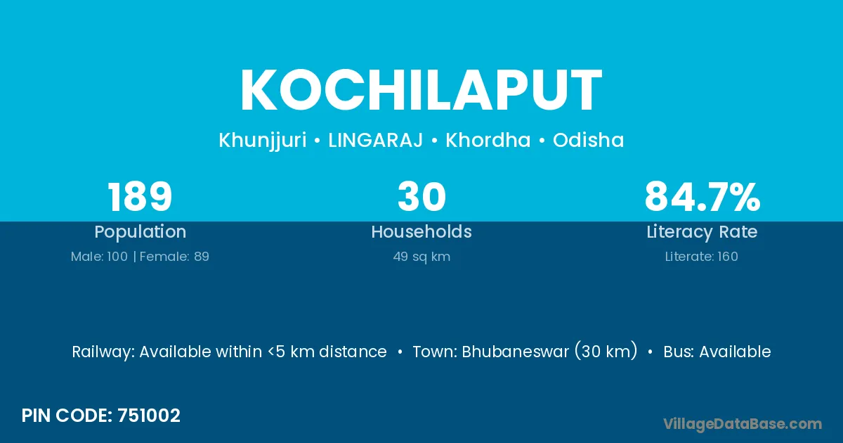 Bhubaneswar (30 km) is the nearest town to Kochilaput village for major economic activities and is located approximately 30 km away.