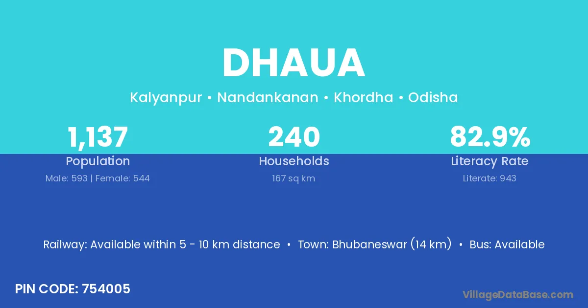 Bhubaneswar (14 km) is the nearest town to Dhaua village for major economic activities and is located approximately 14 km away.