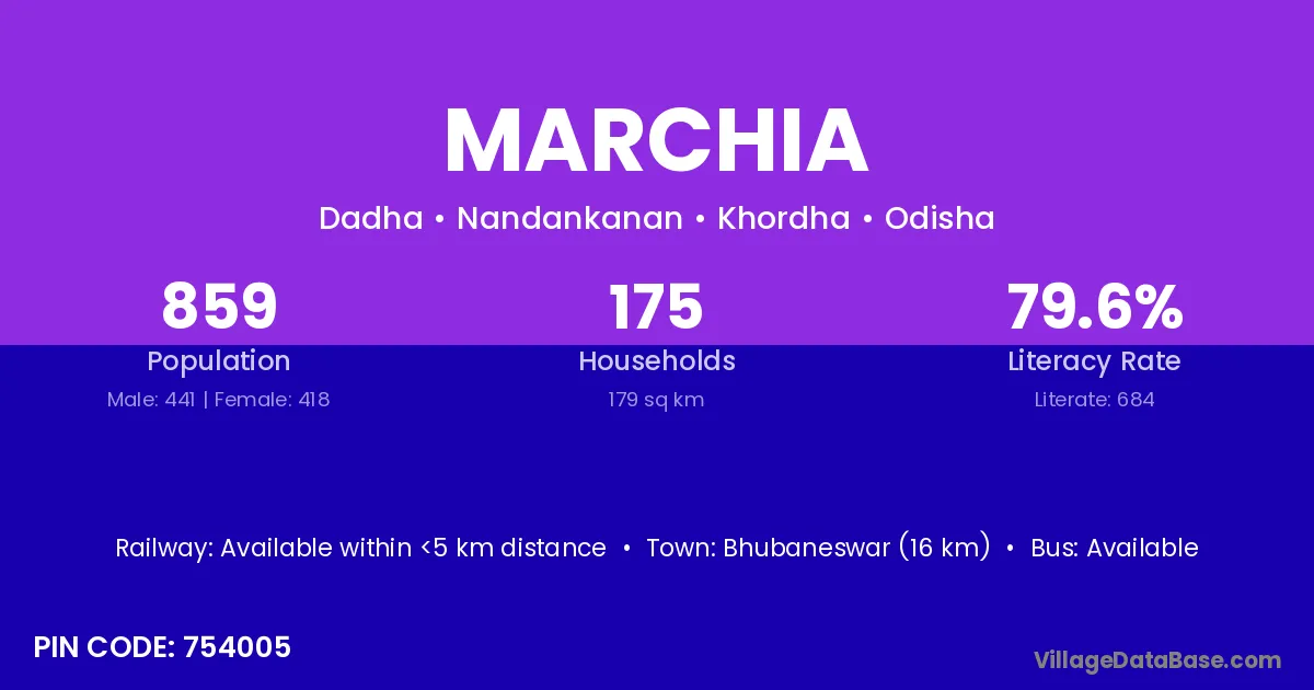 Bhubaneswar (16 km) is the nearest town to Marchia village for major economic activities and is located approximately 16 km away.
