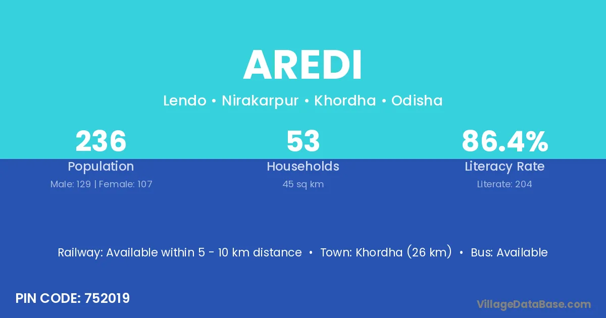 Khordha (26 km) is the nearest town to Aredi village for major economic activities and is located approximately 26 km away.