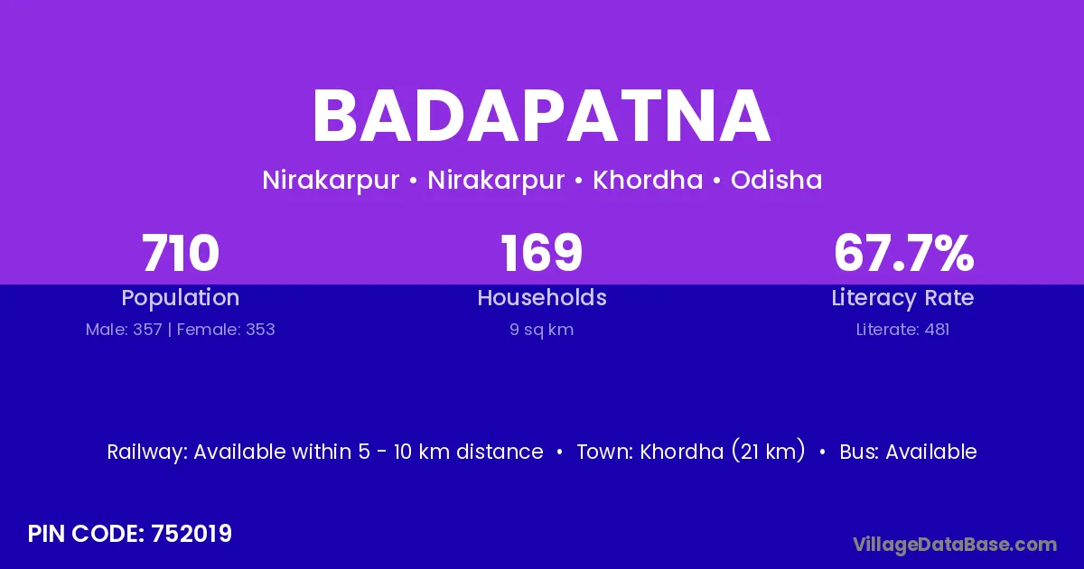 Khordha (21 km) is the nearest town to Badapatna village for major economic activities and is located approximately 21 km away.
