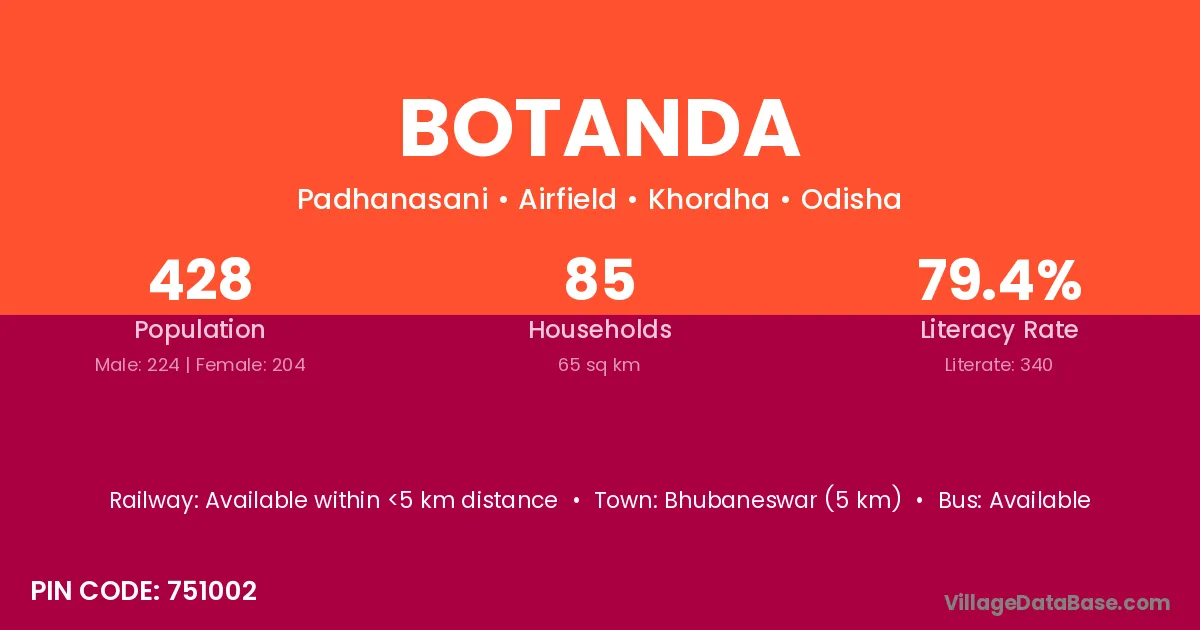 Khordha (18 km) is the nearest town to Botanda village for major economic activities and is located approximately 18 km away.