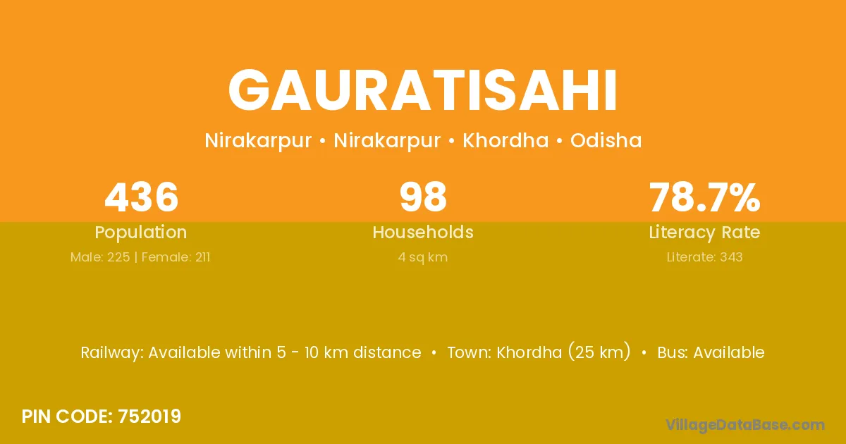 Khordha (25 km) is the nearest town to Gauratisahi village for major economic activities and is located approximately 25 km away.