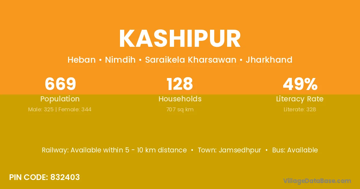 The literacy rate of Kashipur village is 80.86%. Male literacy stands at 85.03% and female literacy at 76.43%.