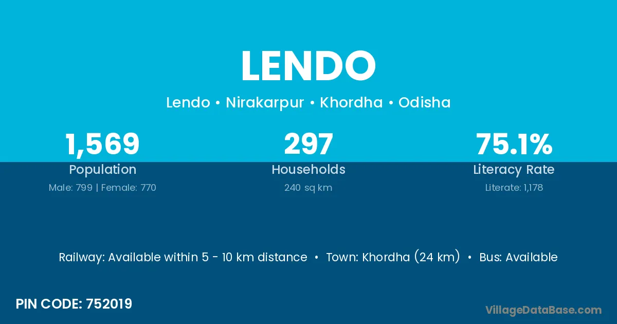 Khordha (24 km) is the nearest town to Lendo village for major economic activities and is located approximately 24 km away.