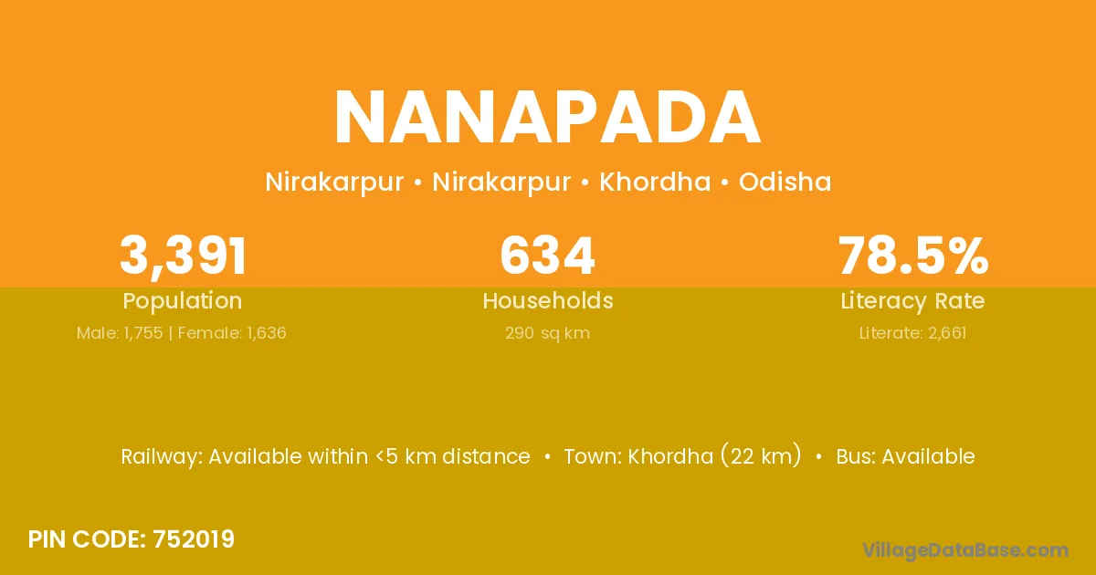 Khordha (22 km) is the nearest town to Nanapada village for major economic activities and is located approximately 22 km away.