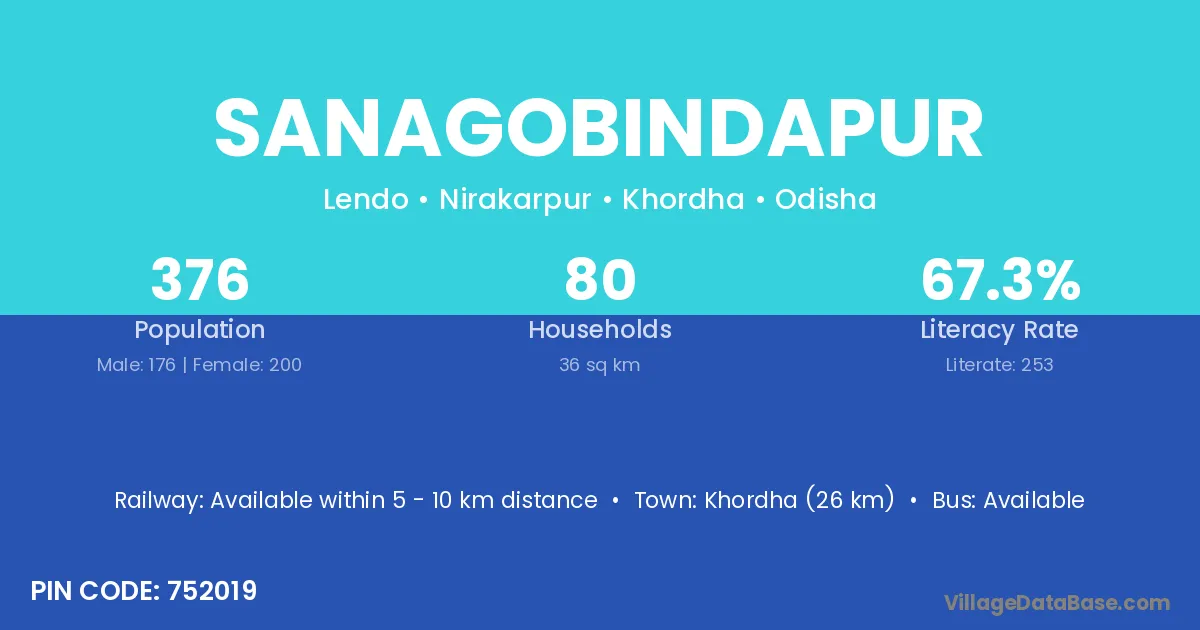 Khordha (26 km) is the nearest town to Sanagobindapur village for major economic activities and is located approximately 26 km away.