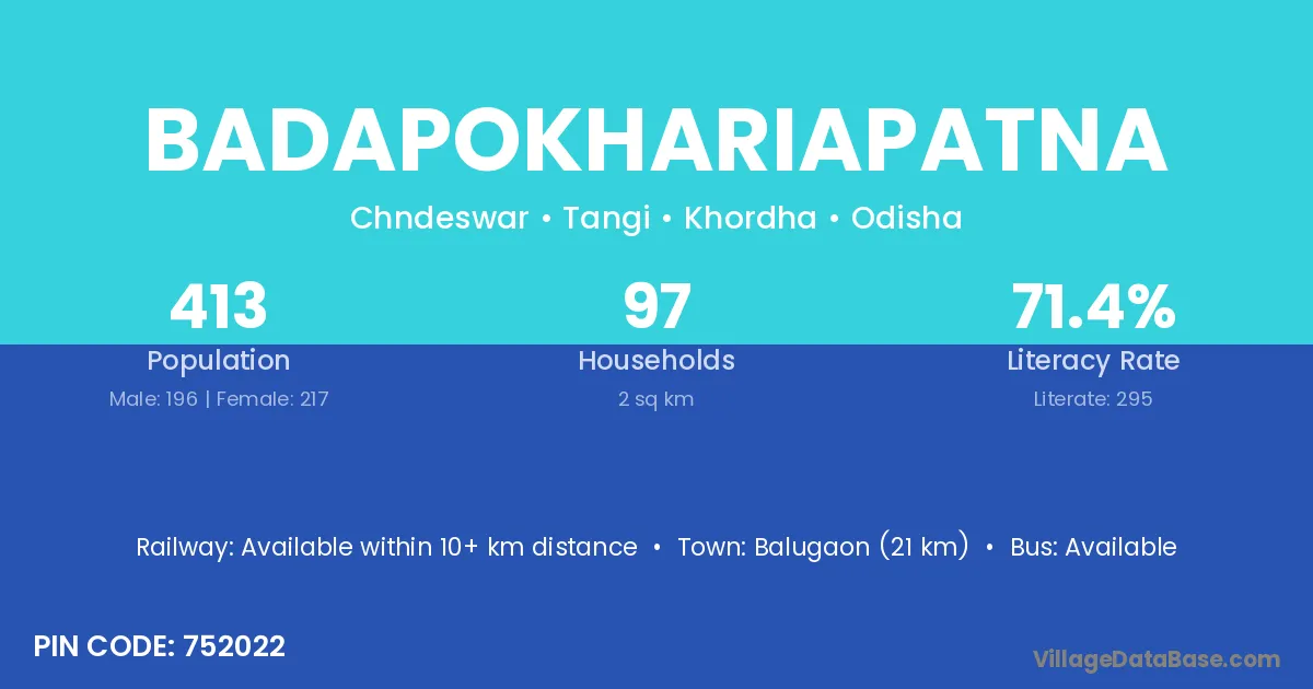 Badapokhariapatna village has a total population of 413 people, of which 196 are males and 217 are females.