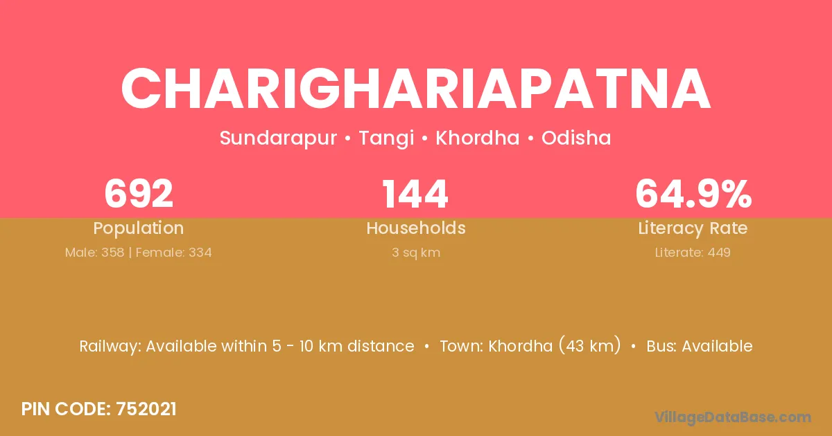 Khordha (43 km) is the nearest town to Charighariapatna village for major economic activities and is located approximately 43 km away.