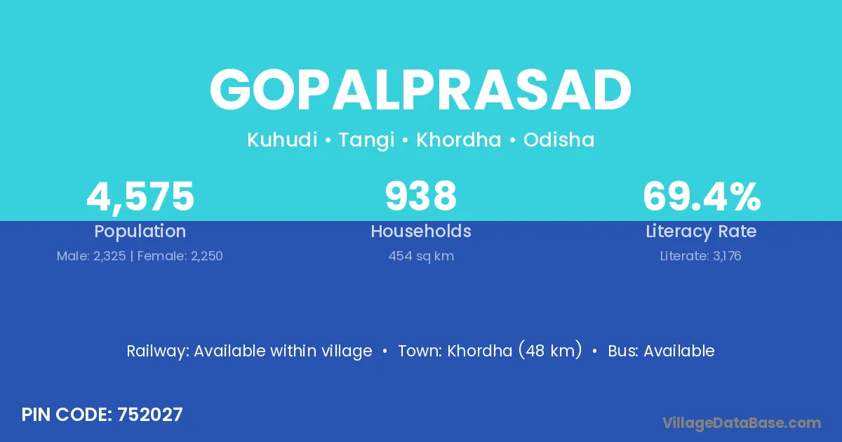Khordha (48 km) is the nearest town to Gopalprasad village for major economic activities and is located approximately 48 km away.