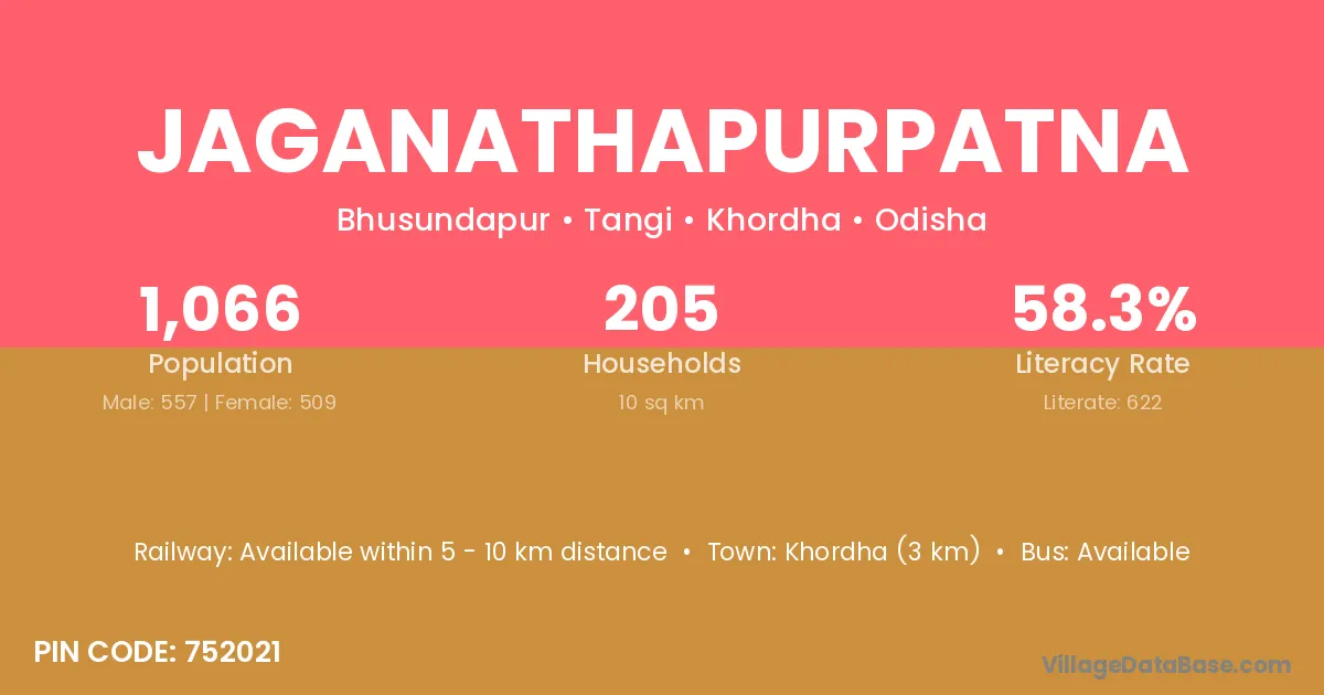 Khordha (3 km) is the nearest town to Jaganathapurpatna village for major economic activities and is located approximately 3 km away.