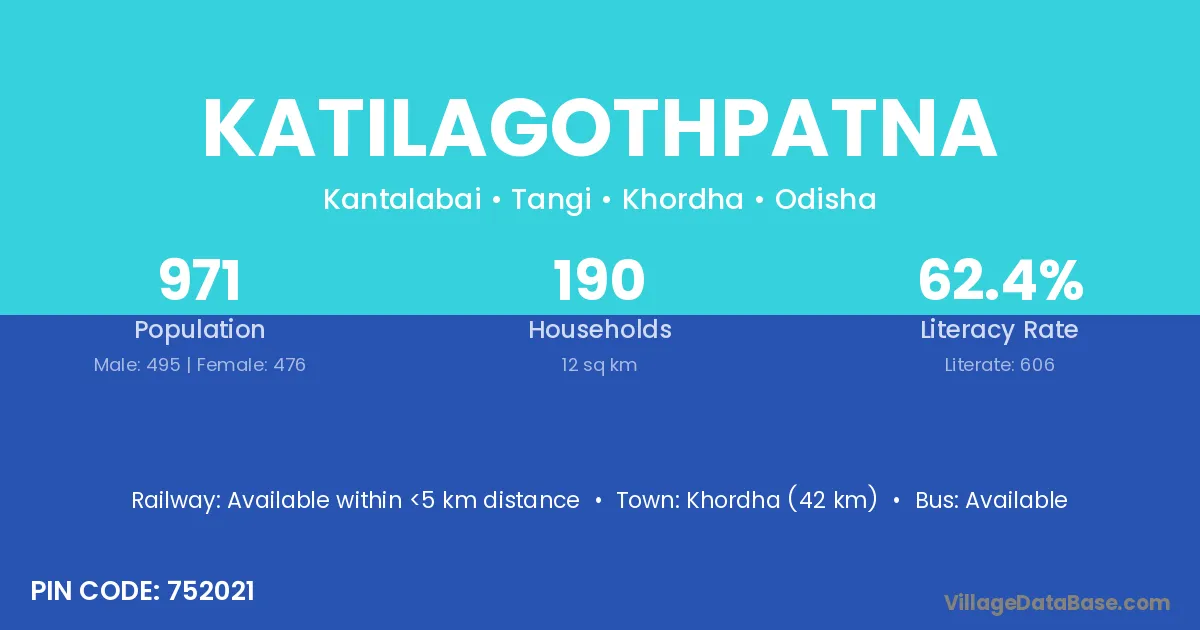 Katilagothpatna village has a total population of 971 people, of which 495 are males and 476 are females.