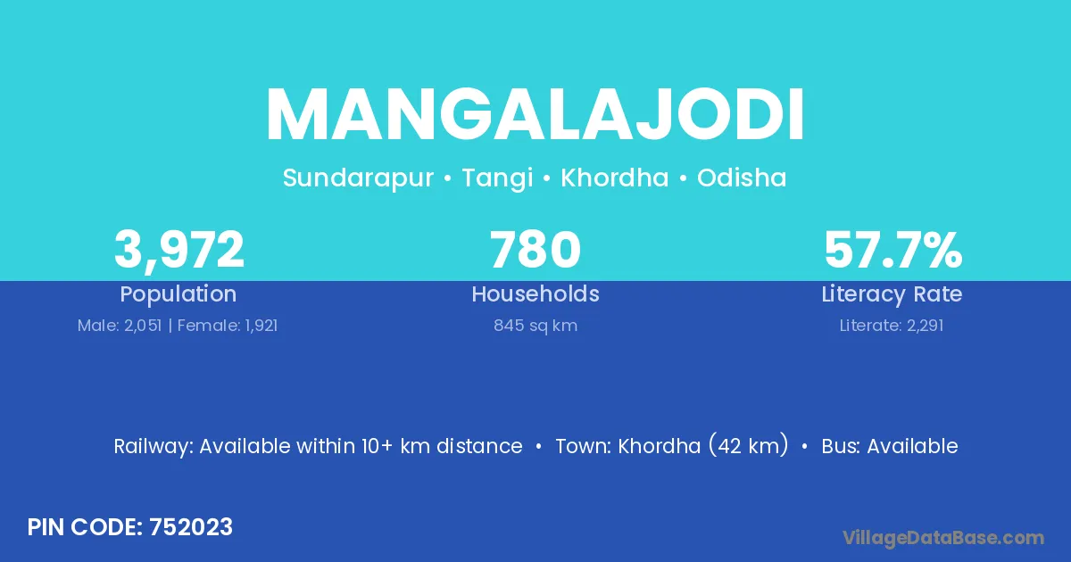 Khordha (42 km) is the nearest town to Mangalajodi village for major economic activities and is located approximately 42 km away.