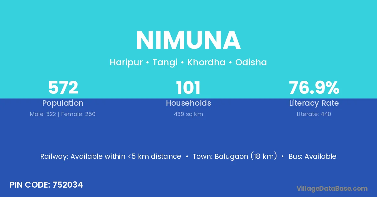 Balugaon (18 km) is the nearest town to Nimuna village for major economic activities and is located approximately 18 km away.