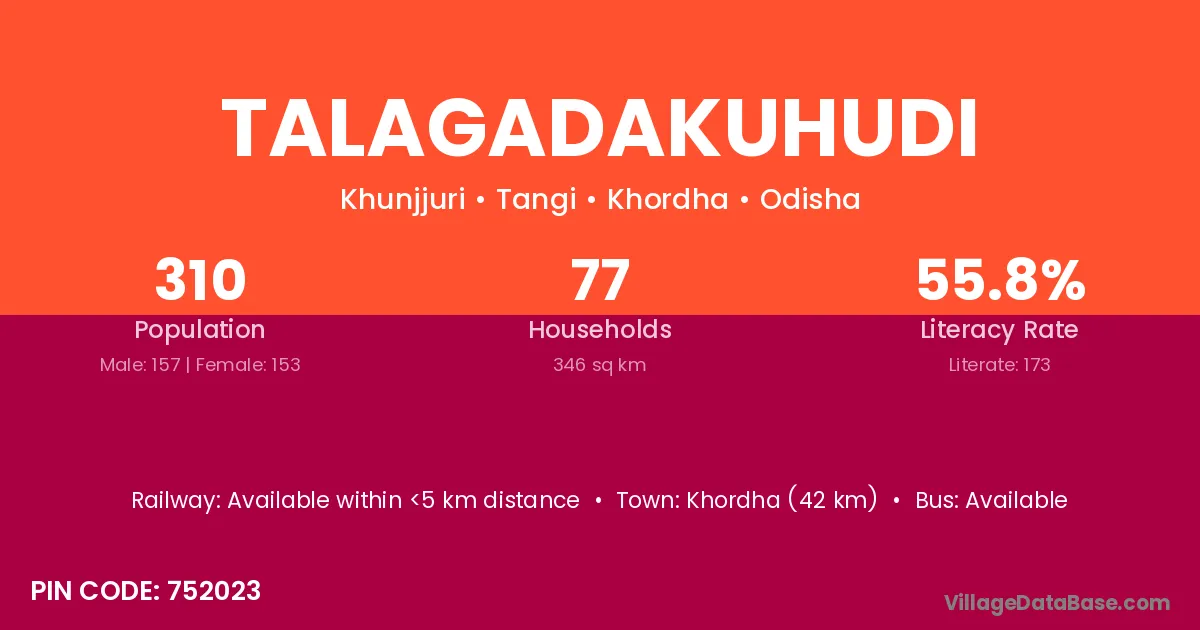 Khordha (42 km) is the nearest town to Talagadakuhudi village for major economic activities and is located approximately 42 km away.