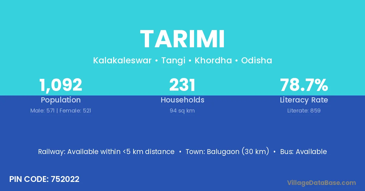 Balugaon (30 km) is the nearest town to Tarimi village for major economic activities and is located approximately 30 km away.