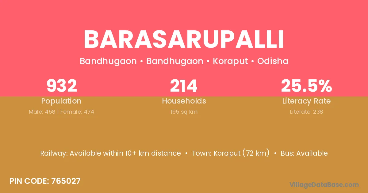 Koraput (72 km) is the nearest town to Barasarupalli village for major economic activities and is located approximately 72 km away.