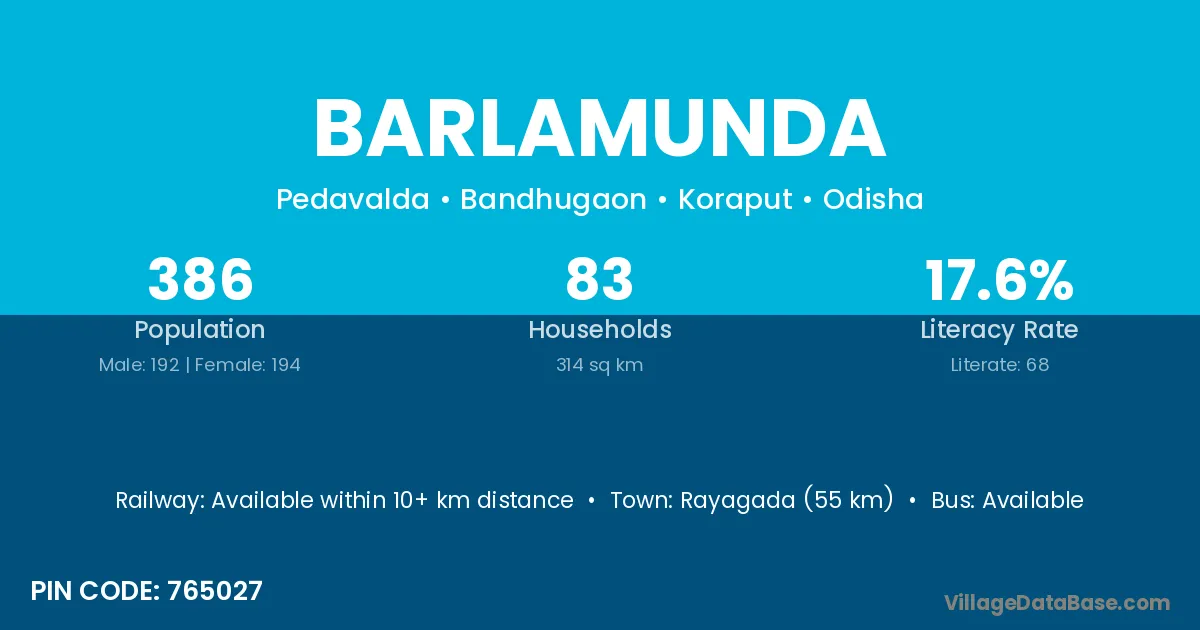 Rayagada (55 km) is the nearest town to Barlamunda village for major economic activities and is located approximately 55 km away.