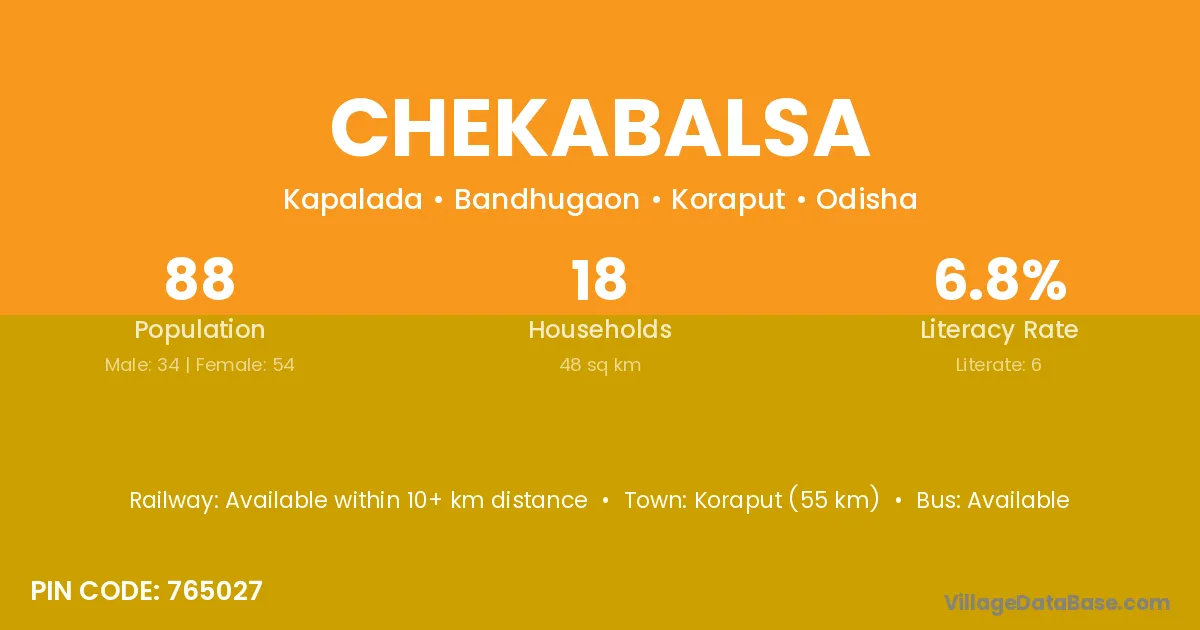 Koraput (55 km) is the nearest town to Chekabalsa village for major economic activities and is located approximately 55 km away.