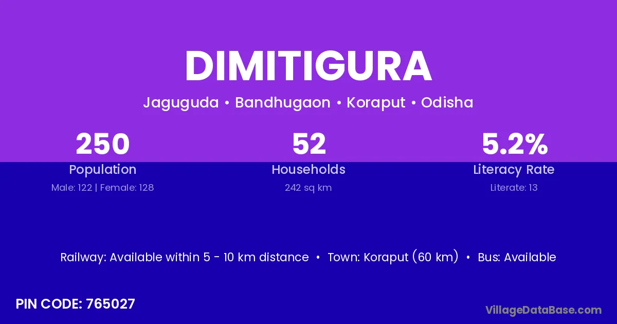 Koraput (60 km) is the nearest town to Dimitigura village for major economic activities and is located approximately 60 km away.