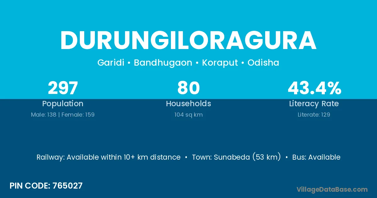 Sunabeda (53 km) is the nearest town to Durungiloragura village for major economic activities and is located approximately 53 km away.