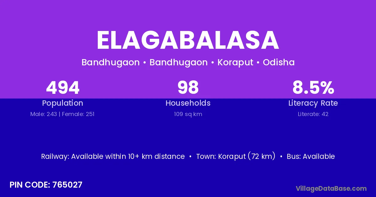 Koraput (72 km) is the nearest town to Elagabalasa village for major economic activities and is located approximately 72 km away.