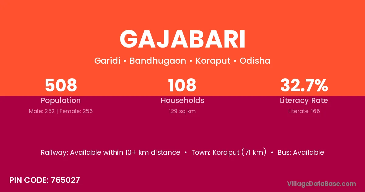 Koraput (71 km) is the nearest town to Gajabari village for major economic activities and is located approximately 71 km away.