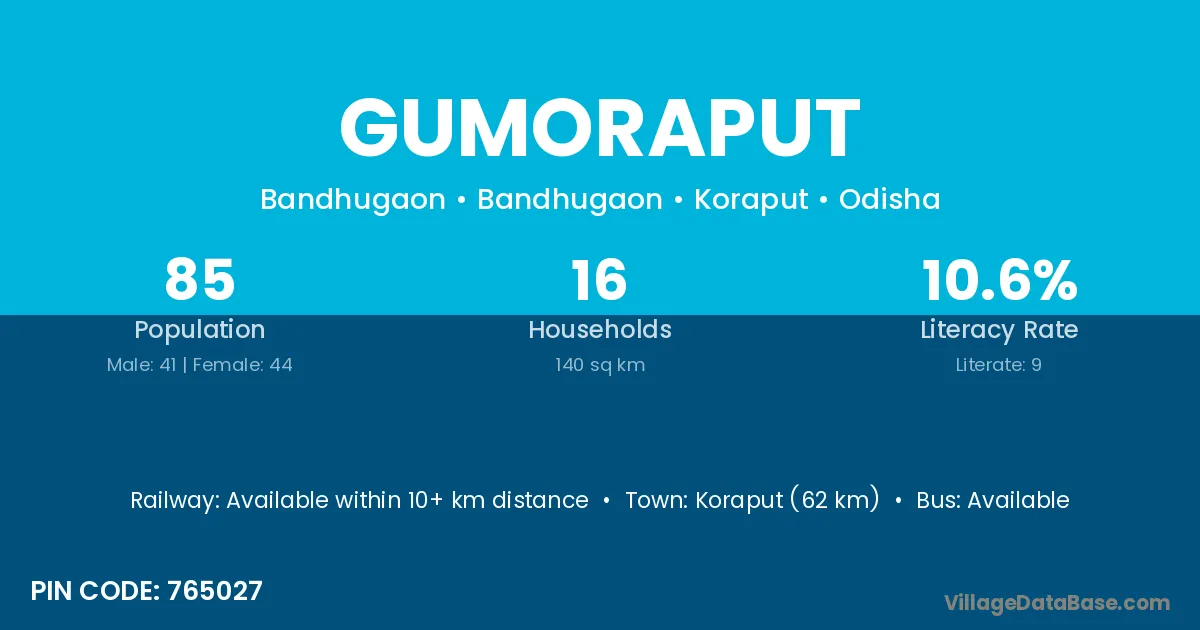 Koraput (62 km) is the nearest town to Gumoraput village for major economic activities and is located approximately 62 km away.