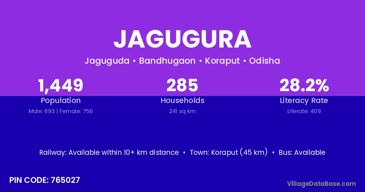 Koraput (45 km) is the nearest town to Jagugura village for major economic activities and is located approximately 45 km away.