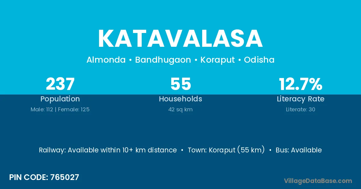 Koraput (55 km) is the nearest town to Katavalasa village for major economic activities and is located approximately 55 km away.