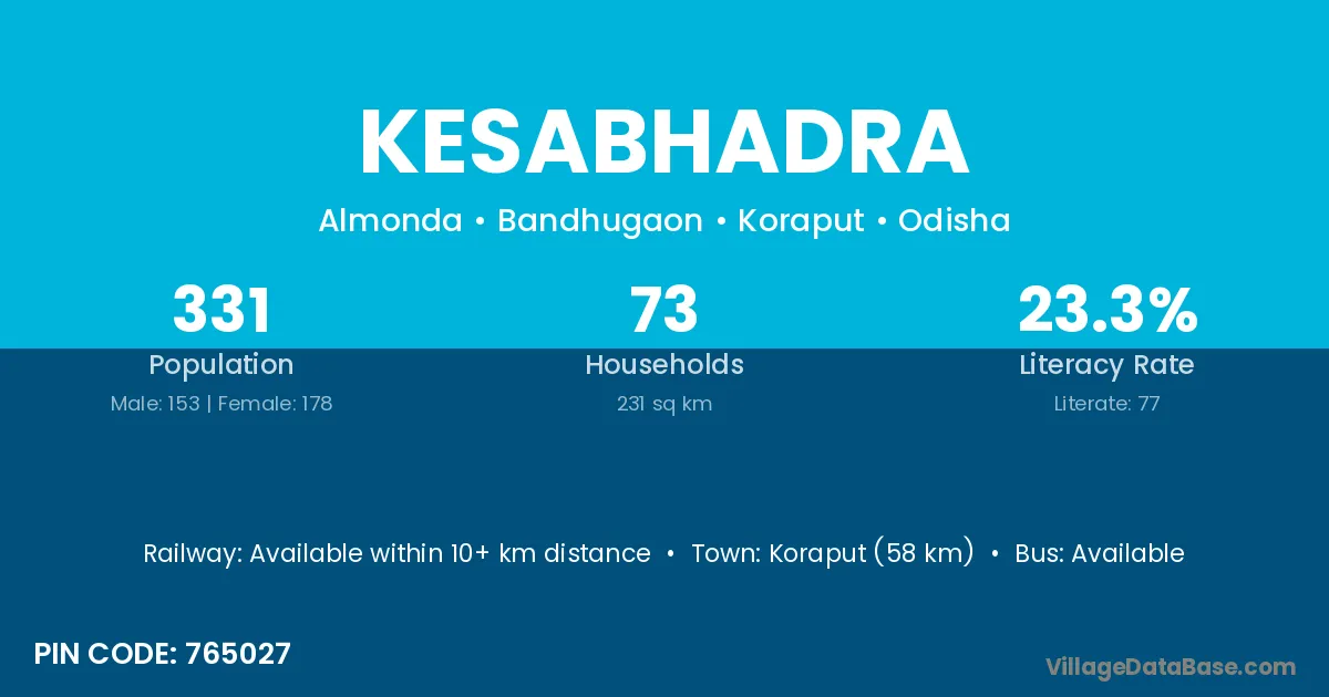 Koraput (58 km) is the nearest town to Kesabhadra village for major economic activities and is located approximately 58 km away.