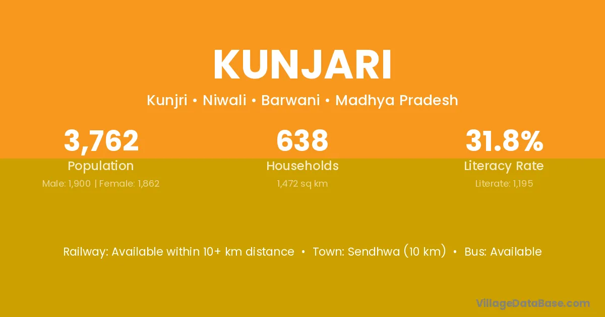 The literacy rate of Kunjari village is 3.68%. Male literacy stands at 5.19% and female literacy at 2.33%.