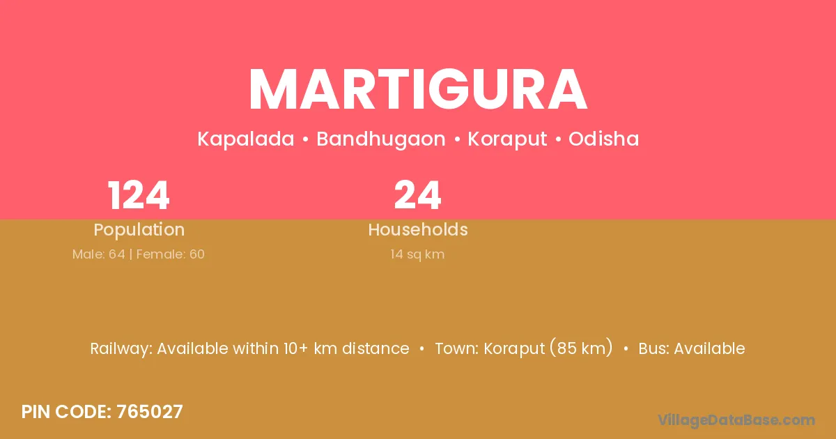 Koraput (85 km) is the nearest town to Martigura village for major economic activities and is located approximately 85 km away.