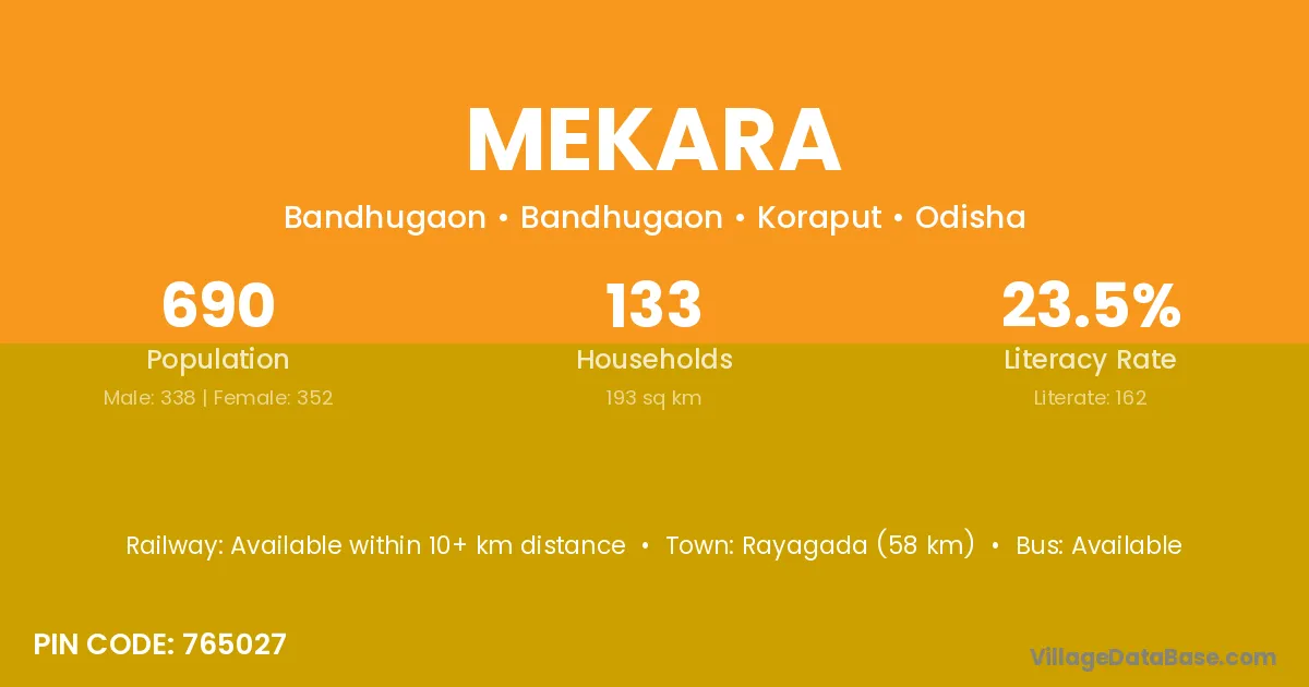 Rayagada (58 km) is the nearest town to Mekara village for major economic activities and is located approximately 58 km away.