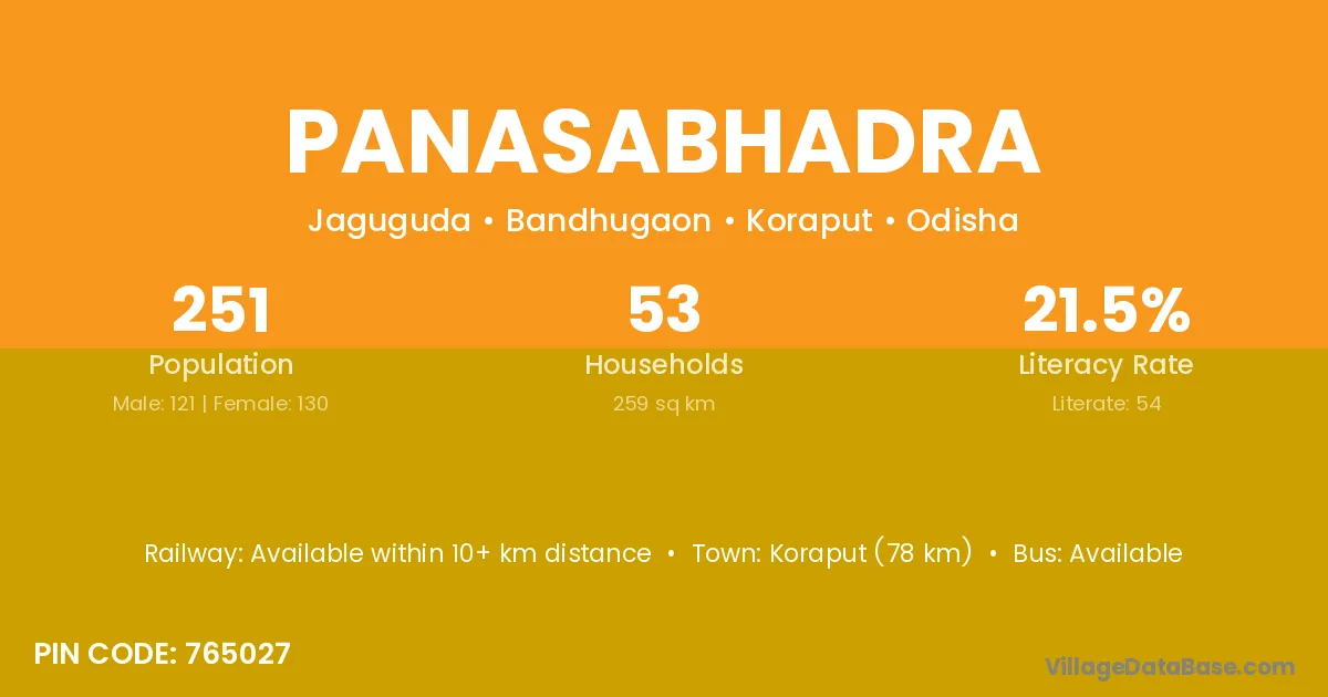 Koraput (78 km) is the nearest town to Panasabhadra village for major economic activities and is located approximately 78 km away.
