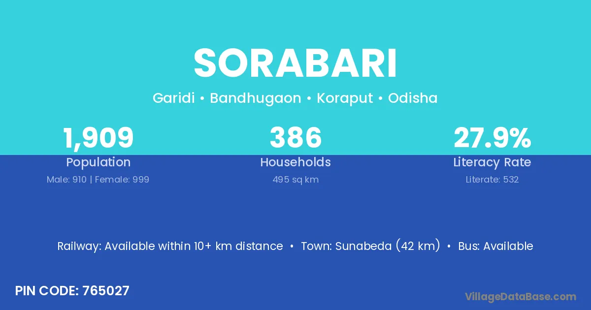 Sunabeda (42 km) is the nearest town to Sorabari village for major economic activities and is located approximately 42 km away.
