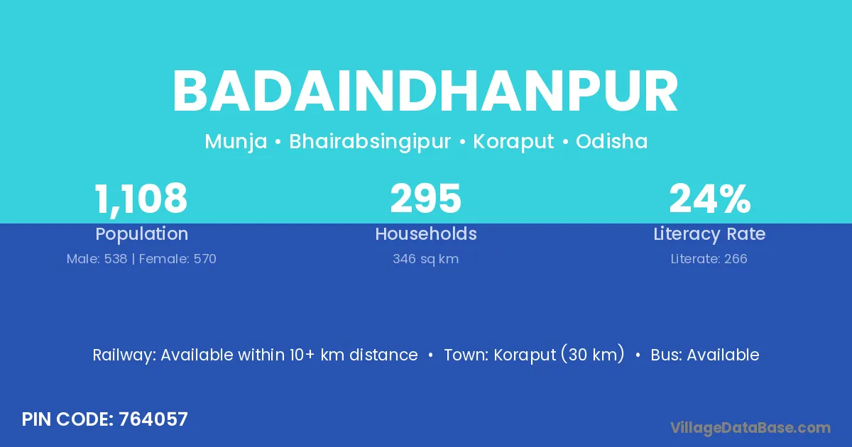 Koraput (30 km) is the nearest town to Badaindhanpur village for major economic activities and is located approximately 30 km away.