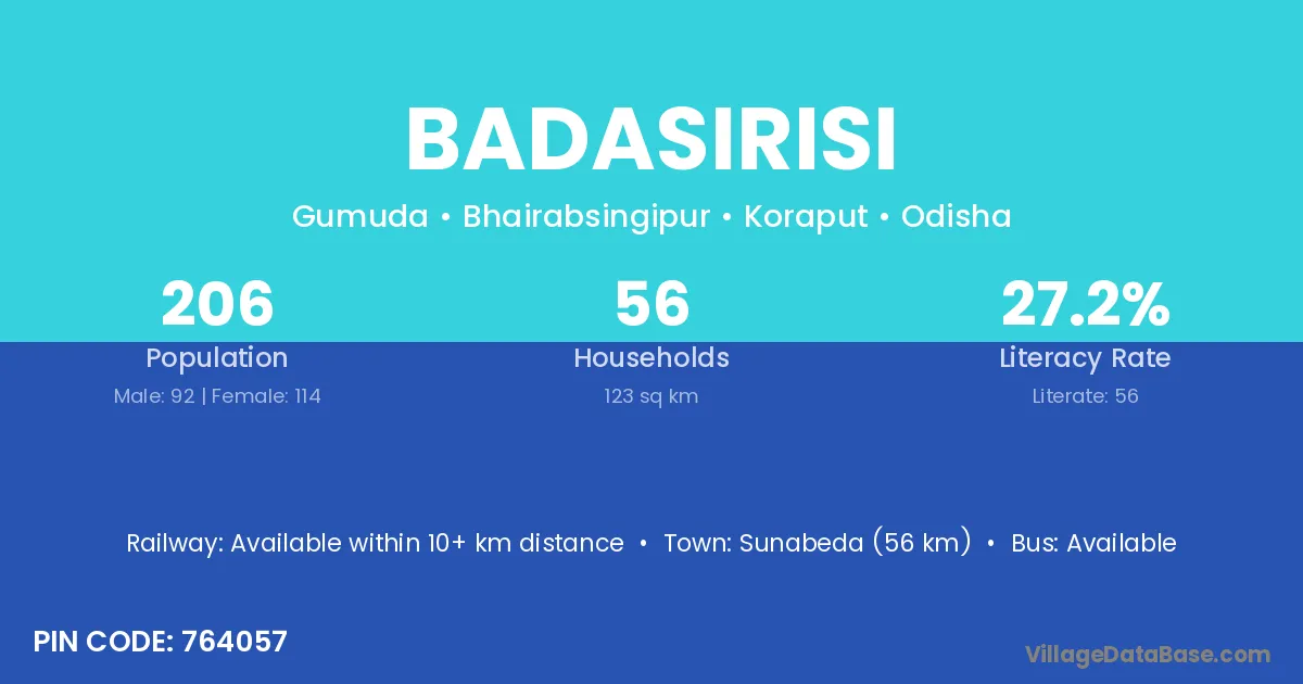 Sunabeda (56 km) is the nearest town to Badasirisi village for major economic activities and is located approximately 56 km away.