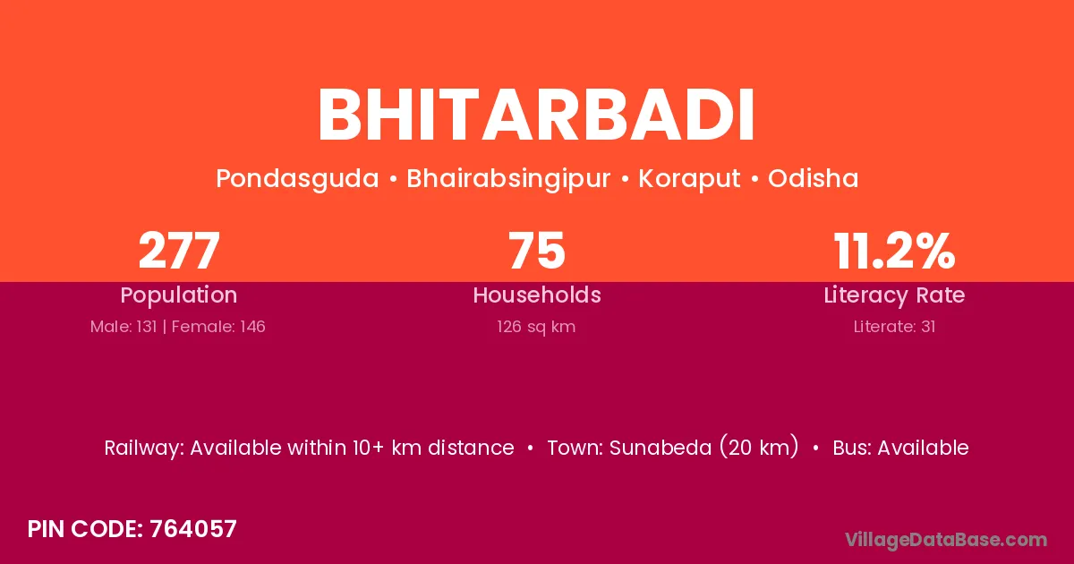 Sunabeda (20 km) is the nearest town to Bhitarbadi village for major economic activities and is located approximately 20 km away.