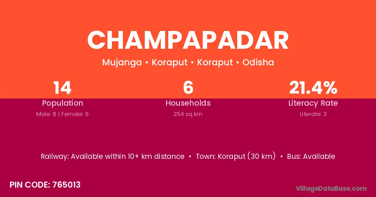 Sunabeda (47 km) is the nearest town to Champapadar village for major economic activities and is located approximately 47 km away.