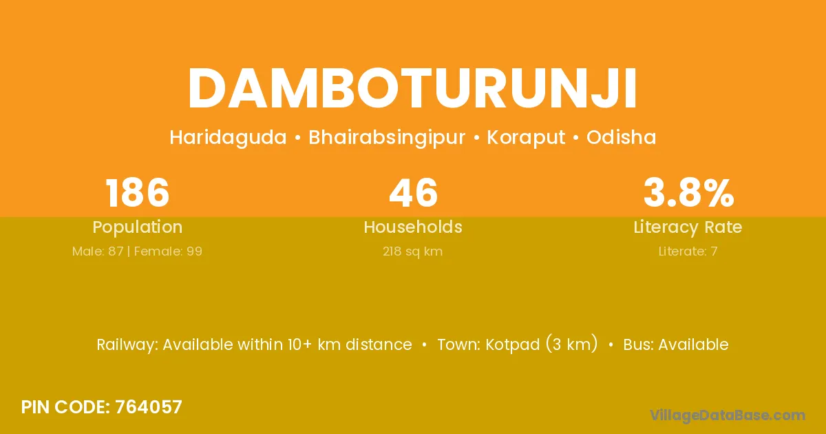 Kotpad (3 km) is the nearest town to Damboturunji village for major economic activities and is located approximately 3 km away.