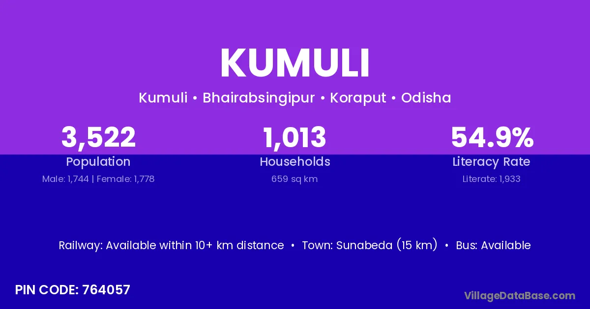 Sunabeda (15 km) is the nearest town to Kumuli village for major economic activities and is located approximately 15 km away.