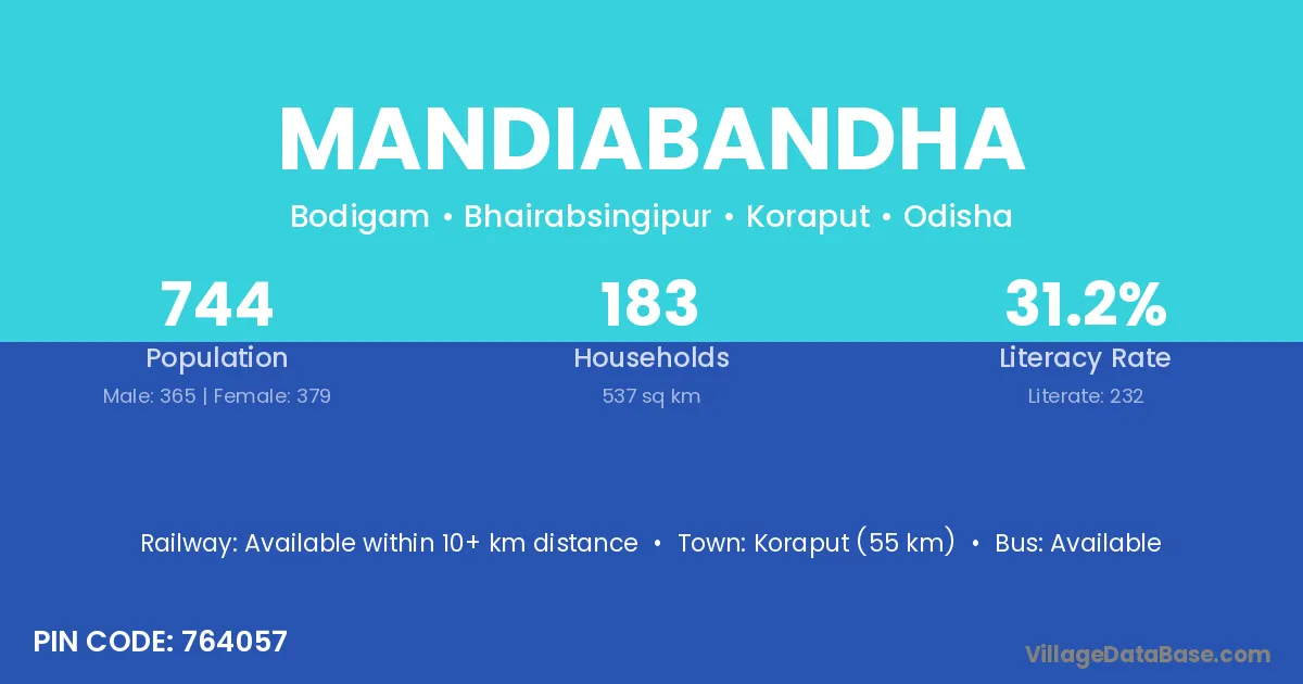Koraput (55 km) is the nearest town to Mandiabandha village for major economic activities and is located approximately 55 km away.
