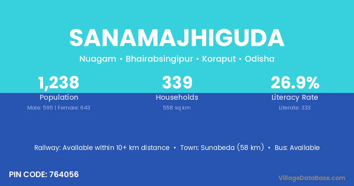 Sunabeda (58 km) is the nearest town to Sanamajhiguda village for major economic activities and is located approximately 58 km away.