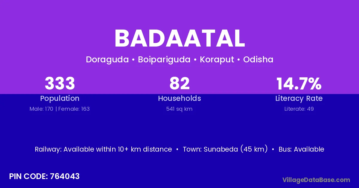 Sunabeda (45 km) is the nearest town to Badaatal village for major economic activities and is located approximately 45 km away.