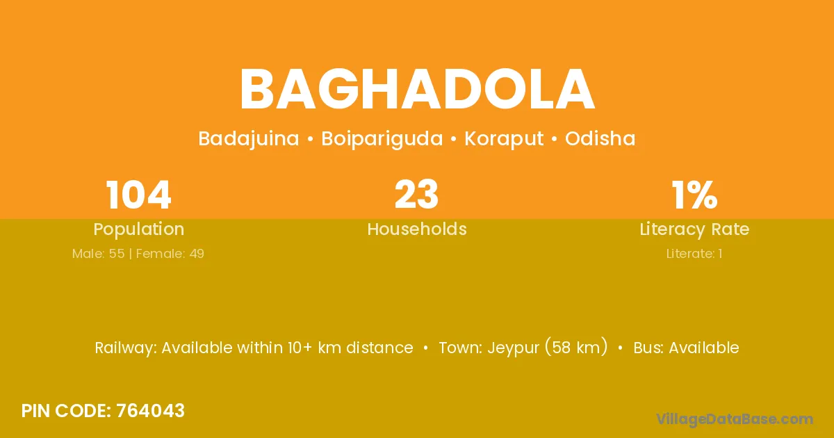 Jeypur (58 km) is the nearest town to Baghadola village for major economic activities and is located approximately 58 km away.