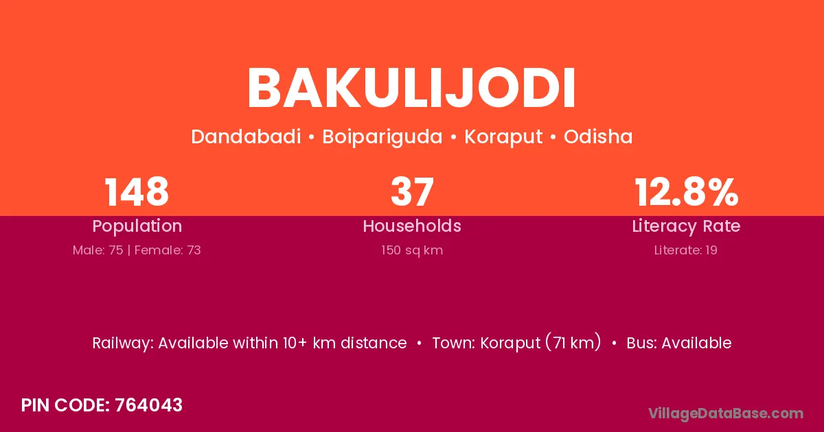Koraput (71 km) is the nearest town to Bakulijodi village for major economic activities and is located approximately 71 km away.