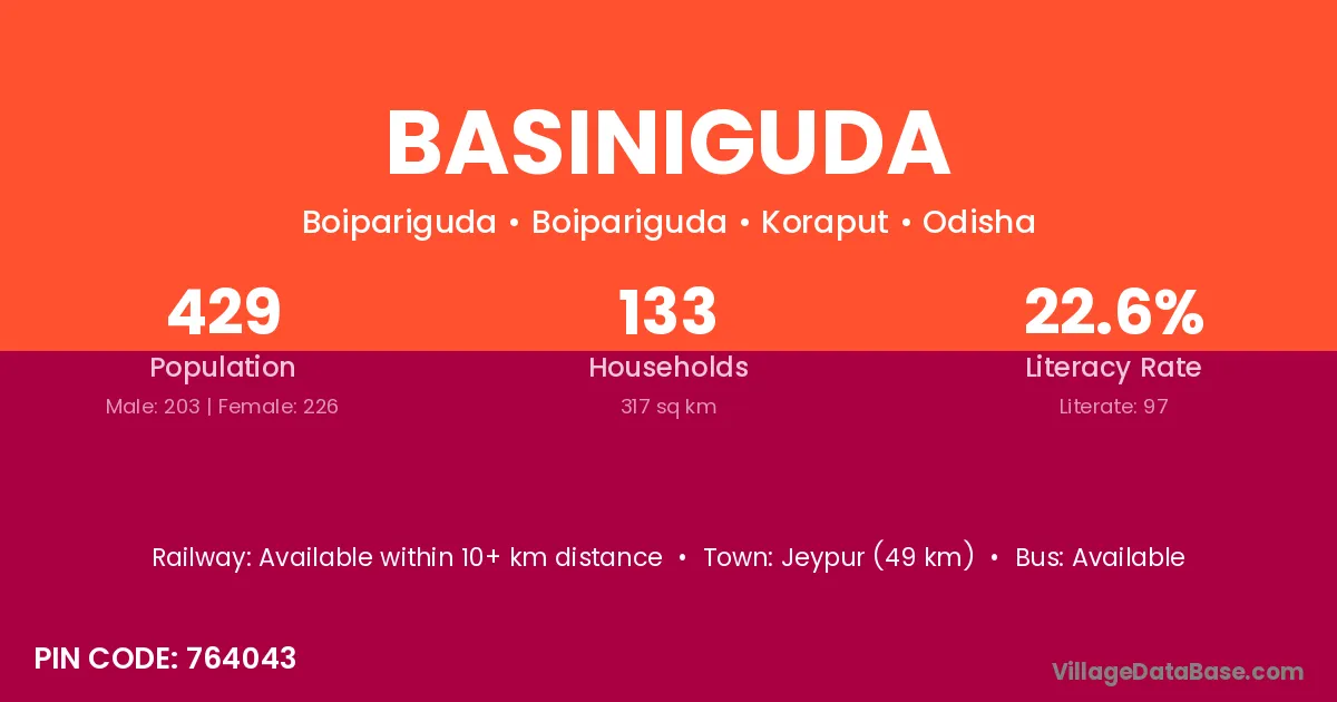 Basiniguda village has a total population of 429 people, of which 203 are males and 226 are females.