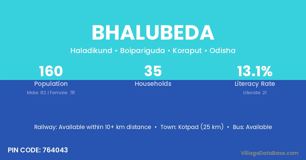 Kotpad (25 km) is the nearest town to Bhalubeda village for major economic activities and is located approximately 25 km away.