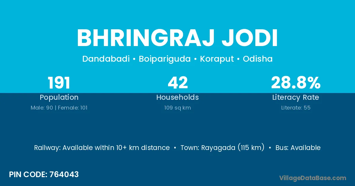 Rayagada (115 km) is the nearest town to Bhringraj Jodi village for major economic activities and is located approximately 115 km away.
